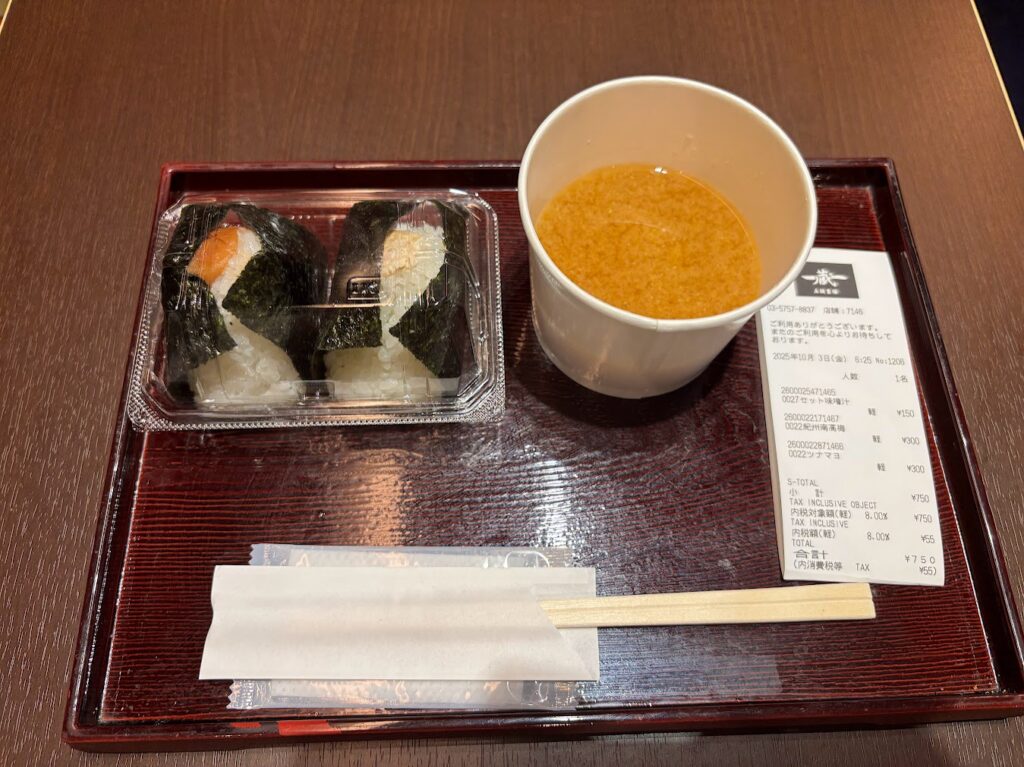 朝ごはんを食べていなかったので、何をを食べようか考えていると、美味しそうなおにぎり屋さんを発見!おにぎりと、お味噌汁のセットをいただきました。