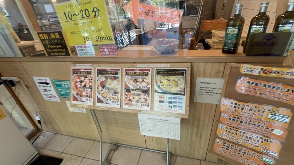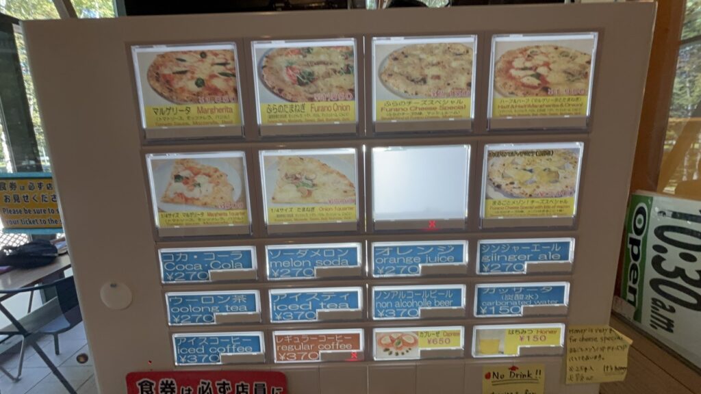 券売機でピザを注文します。今回は、マルゲリータと玉ねぎのピザをそれぞれ4分の1カットでお願いしました。