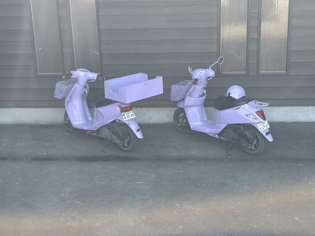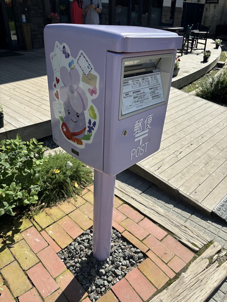 ポストや、バイクがラベンダー色に塗装されていてとてもかわいい。