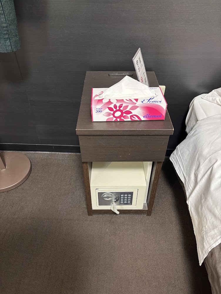 ベッドサイドには、ティッシュと金庫、Wi-Fiのパスワード。コンセントはこちらのボードに2こありました。