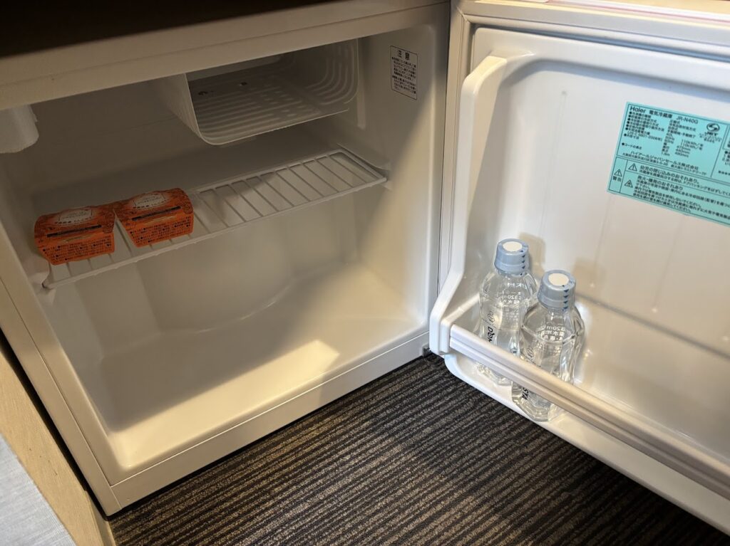 冷蔵庫。庫内にはお水とデザートのゼリーがサービスで入っていました!