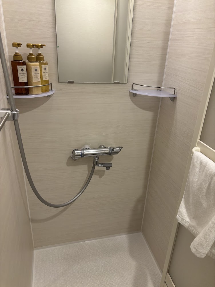 シャワーブース。シャンプー、リンス、ボディソープがありました。