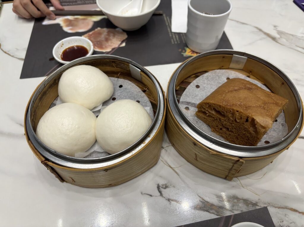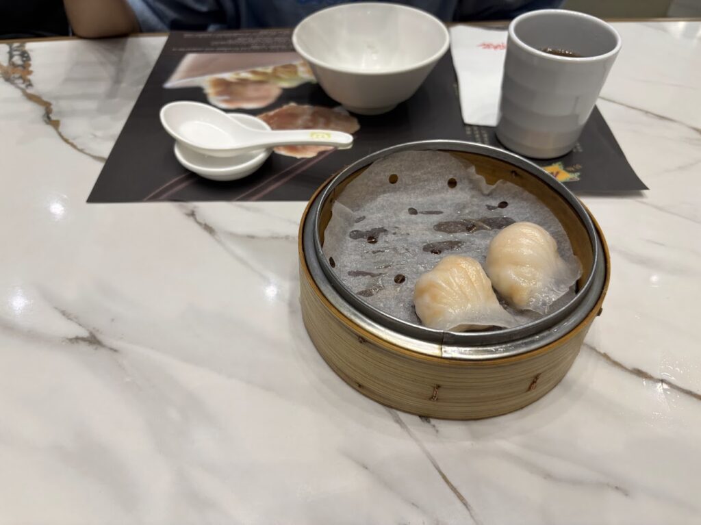 海老蒸し餃子、海老ワンタンメン、マーラーカオとカスタードまんを食べました。