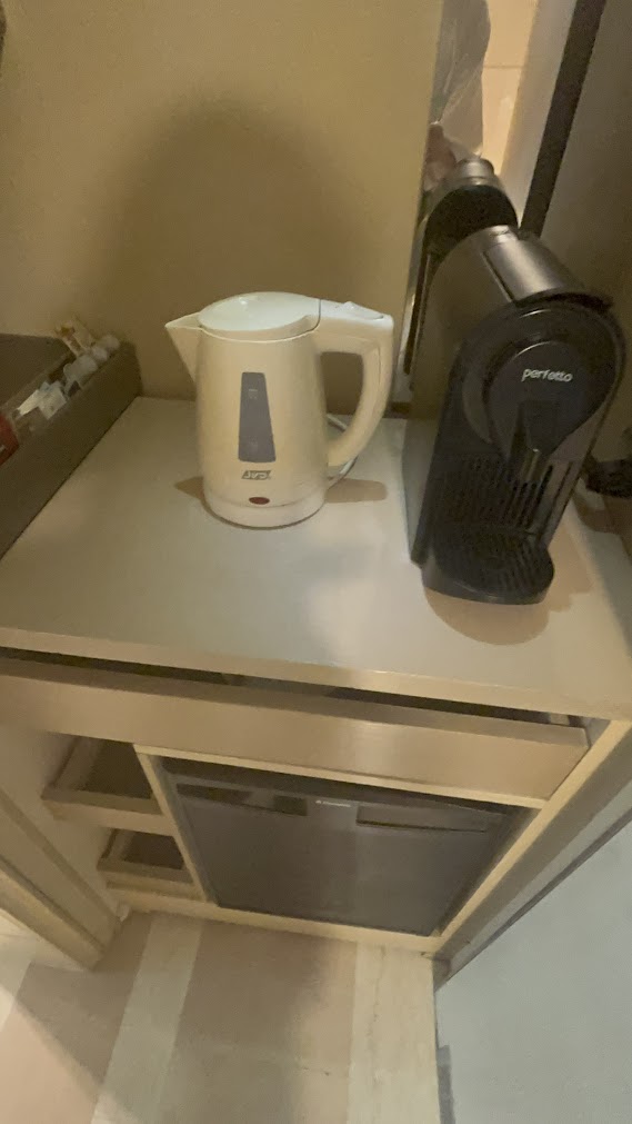 ケトルに、コーヒーマシーン。その下には冷蔵庫があります。