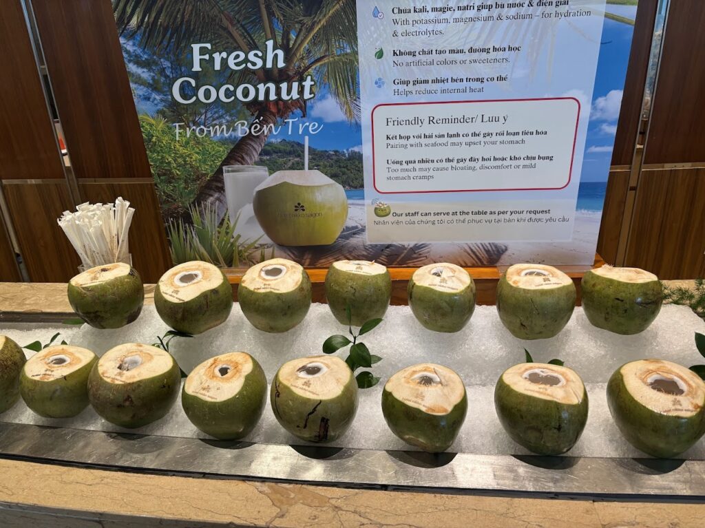 ホテルニッコーサイゴン名物?ココナッツジュースがありました!ポカリスウェットを薄めたような?お味でした。ホテル名の焼き印が押してあります。周りの方も飲んでいる方がたくさんいました。