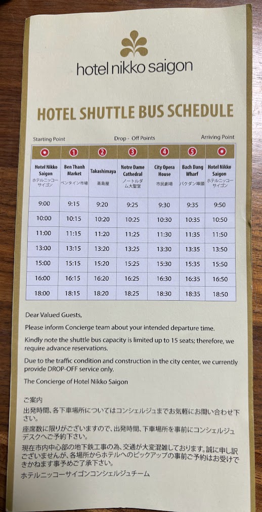 予約制ですが、ホテルから中心地まで出る無料のシャトルバスも出ています。こちらがシャトルバスの時刻表です。
