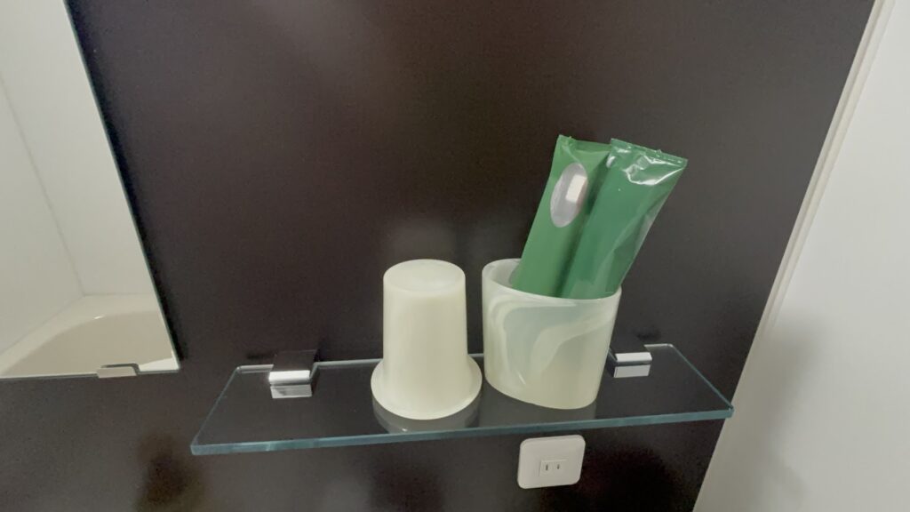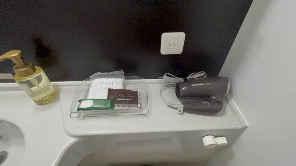 アメニティは、ブラシとウォッシュタオル、化粧水、洗顔フォームのセット、歯ブラシがあります。