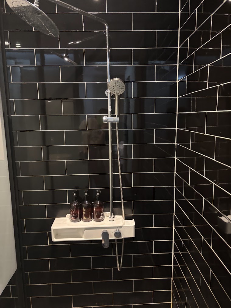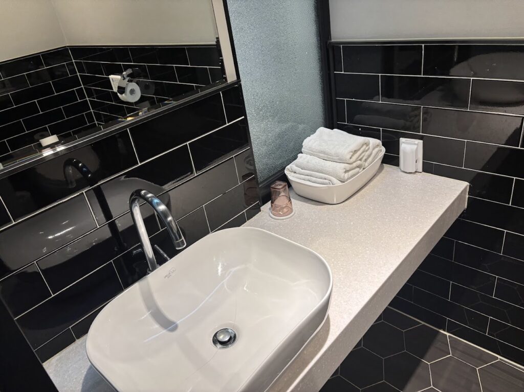 お部屋は広々として、無機質感があり、とてもおしゃれです。備品がたくさん!ドライヤーはもちろん、ヘアアイロンや、化粧水、ヘアスプレーなども完備している。