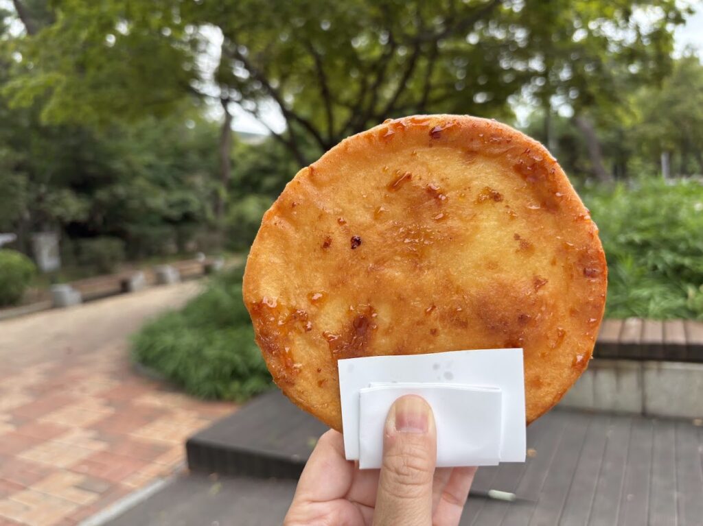 想像していたホットクとは違い、見た目はおせんべいのよう!まわりに飴が絡められているような?素朴な味でとっても美味しかったです!固めなので、食べるのに少し苦労します。