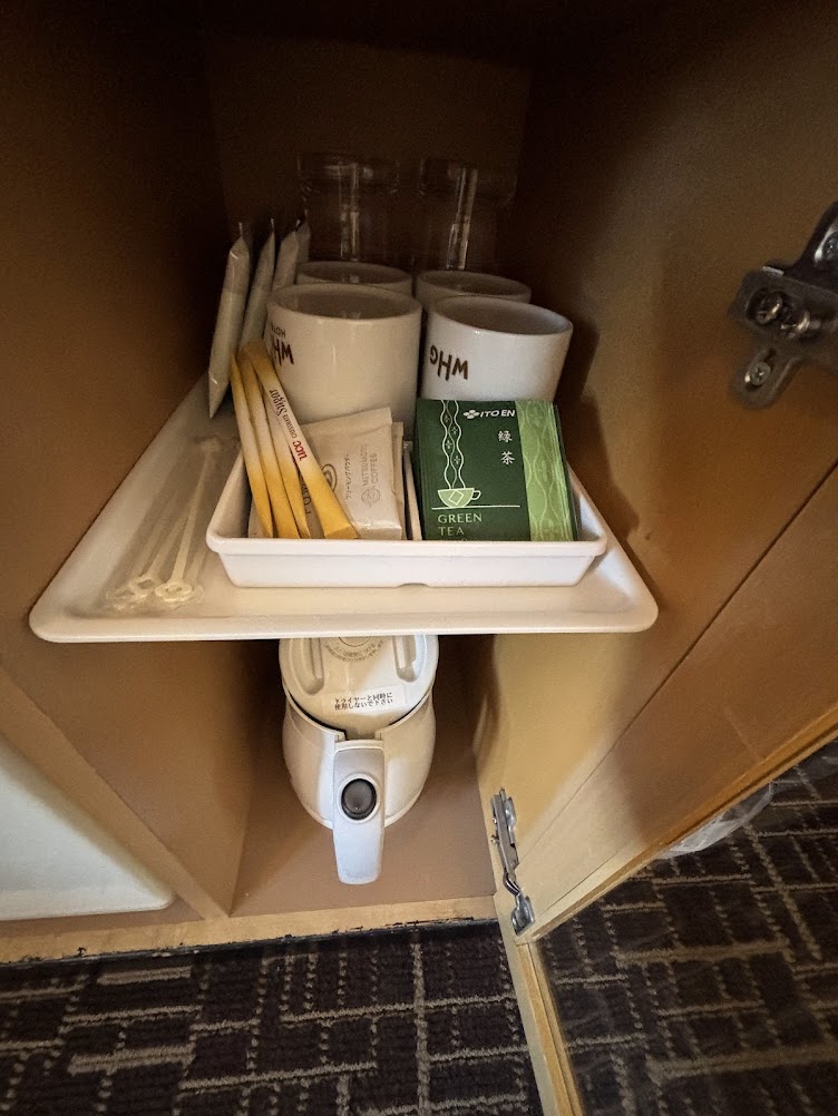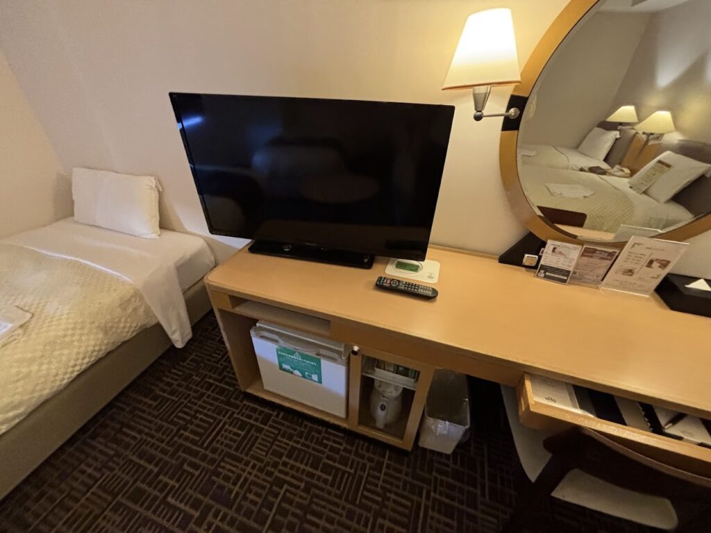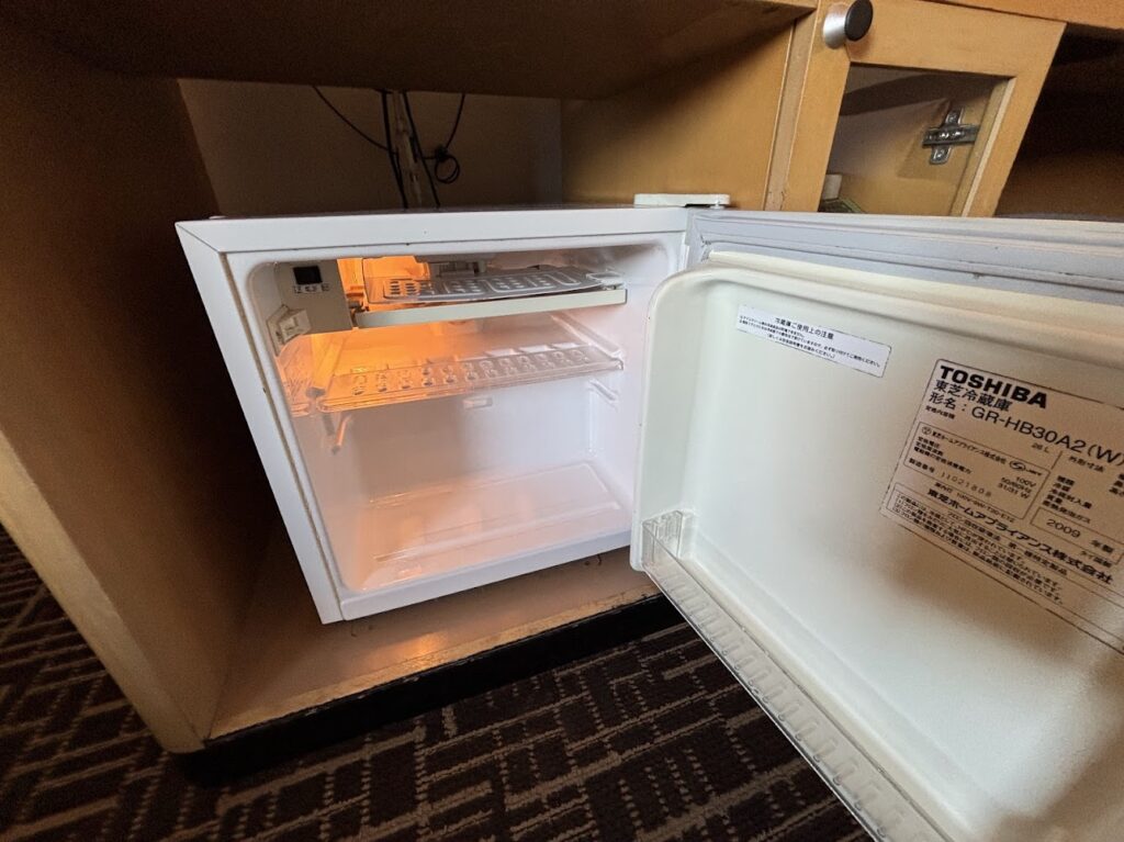 冷蔵庫。お水はありませんでしたが、ワシントンホテルの会員登録をするとお水が1本もらえるようでした。