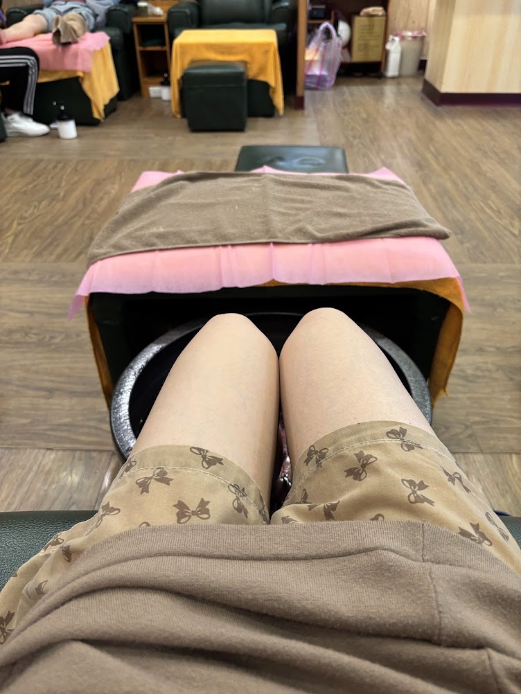 ハーフパンツに着替え、足湯で温まったあとマッサージ開始。
