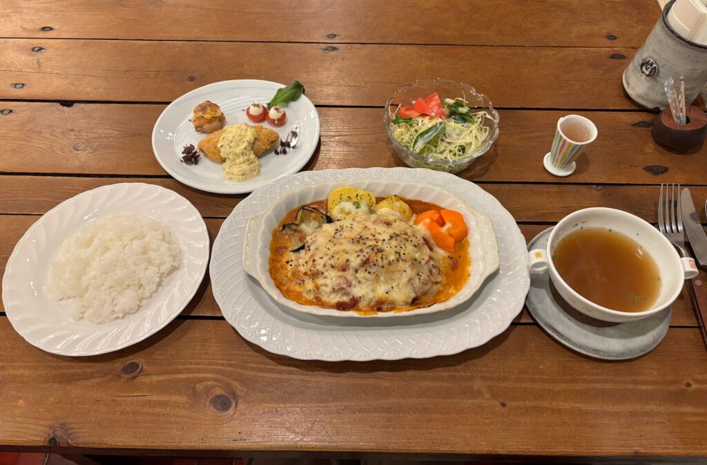 メインはチーズトマトハンバーグ!副菜はお魚のフライでした。とってもおしゃれに盛り付けされています。